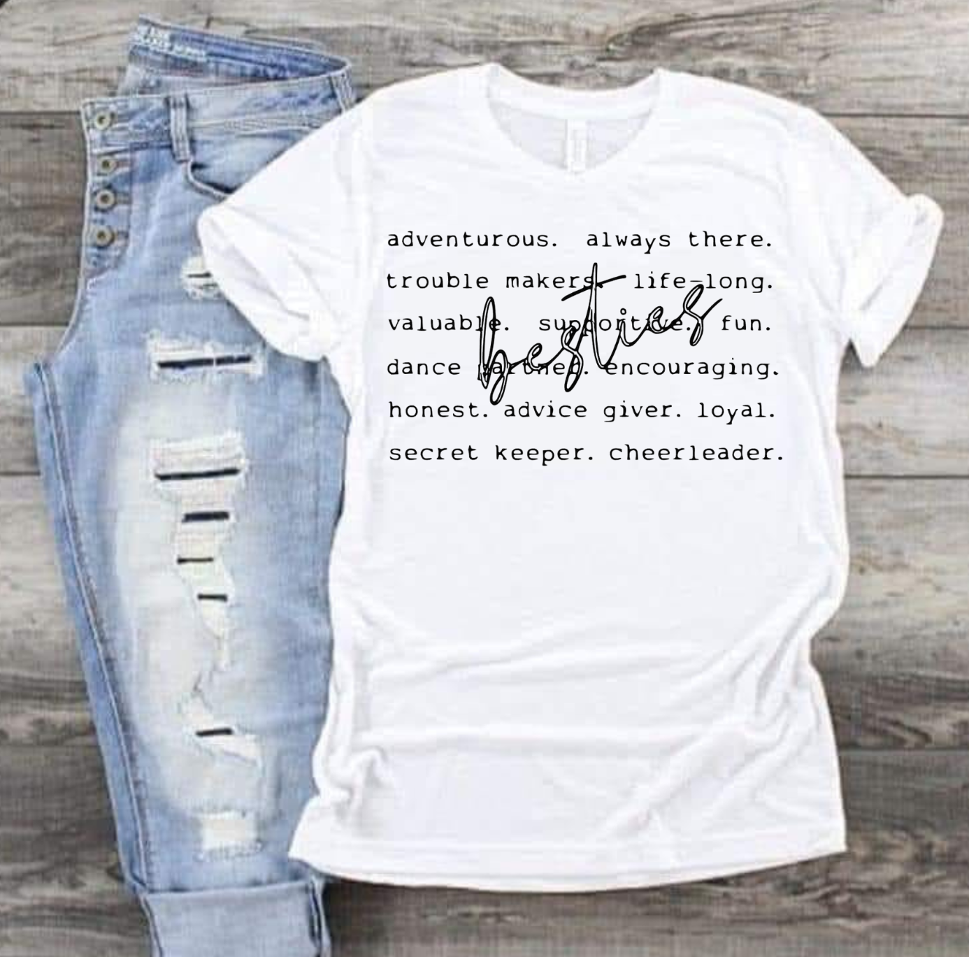 Get ready to show off your friendship with the Besties T-Shirt! Perfect for best friends, this shirt is sure to be a hit with its quirky design and playful tone. Let everyone know who your bestie is with this must-have tee. (BFFs forever!)
