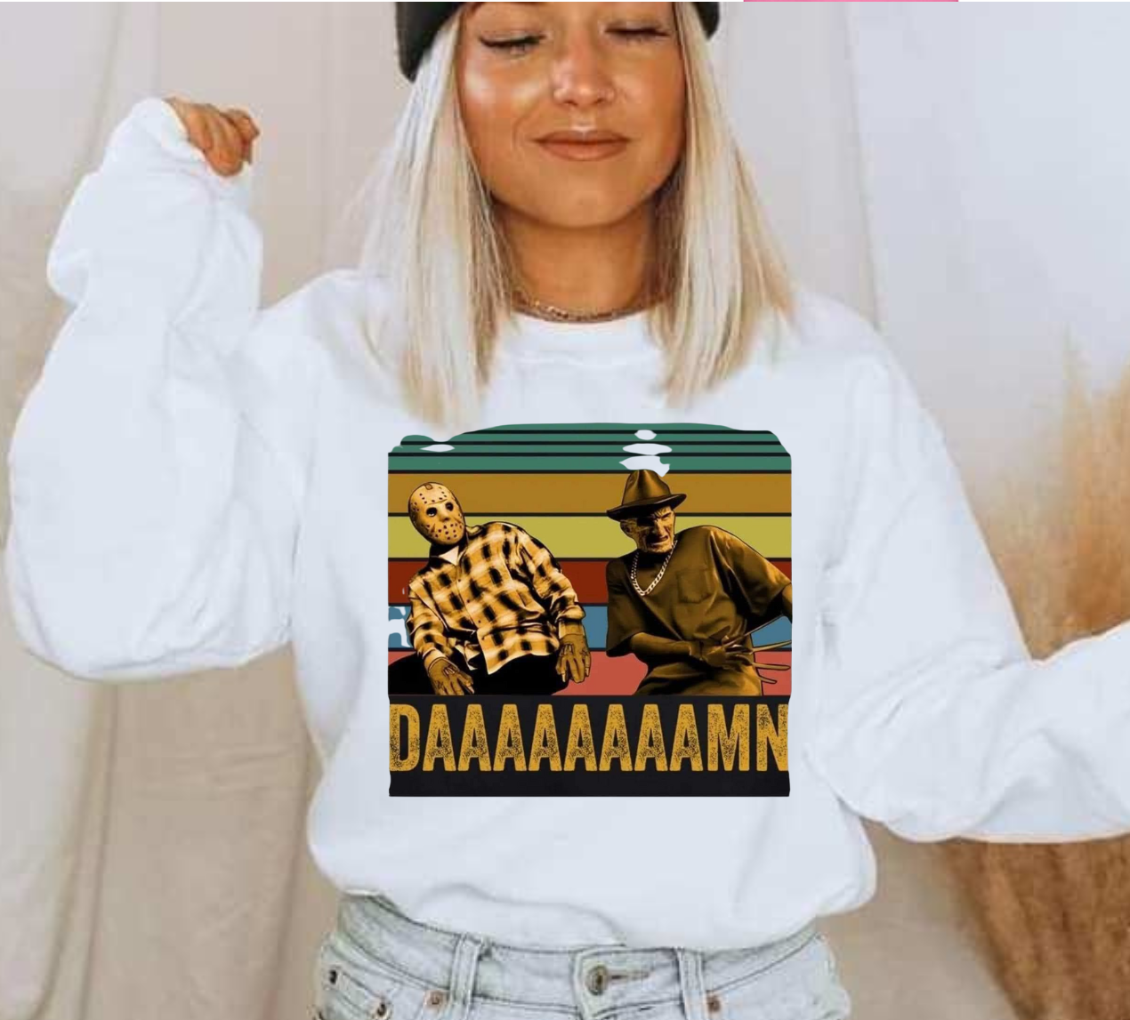 Get ready to spook up your Halloween game with the Daaaaaaamn Freddy and Jason shirt! Inspired by the classic Friday movie, this shirt will make you stand out in any party. Scare your friends and have a killer time with this quirky and playful shirt.