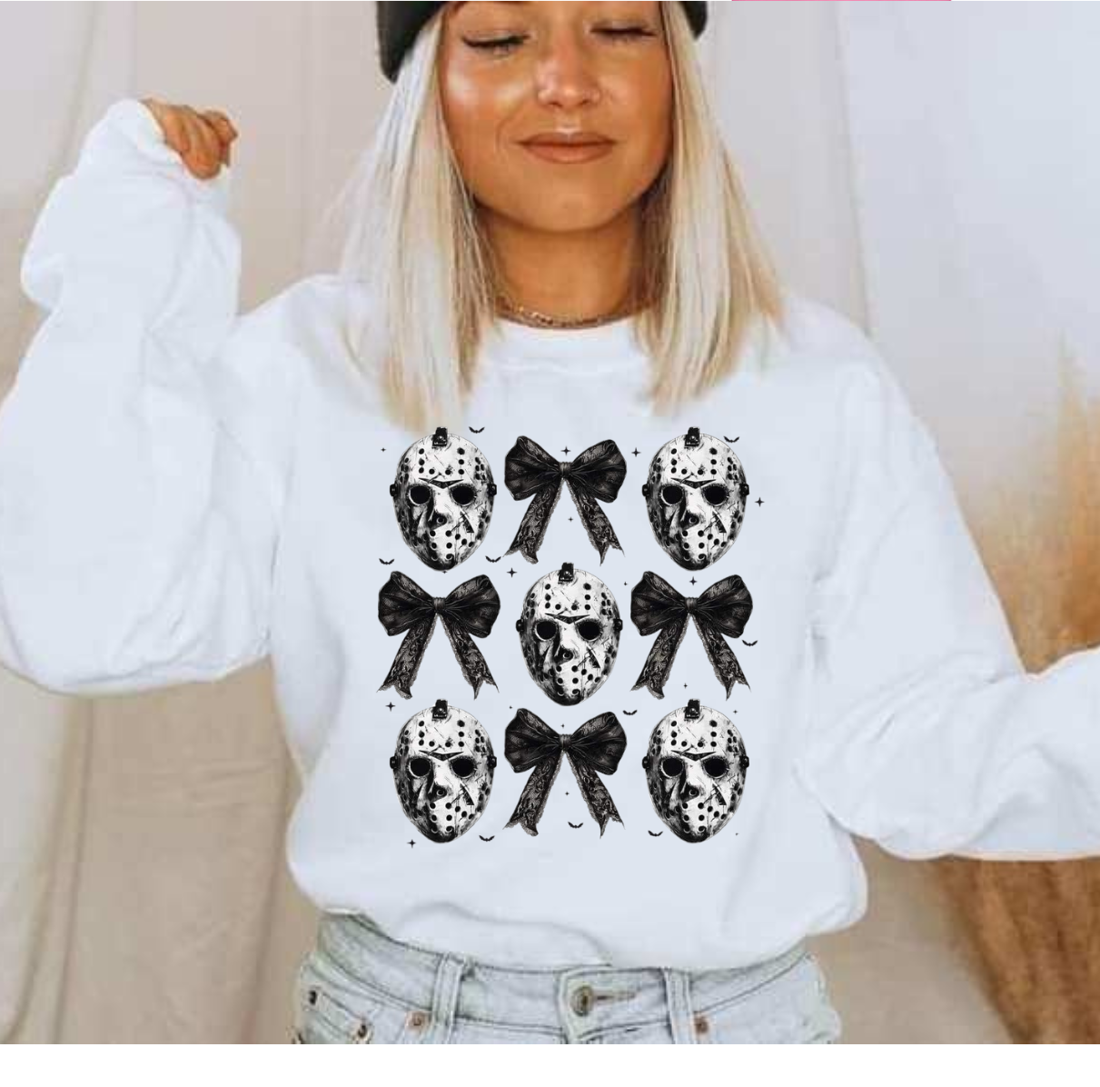 Get spooky with our Mask and Coquette Bows shirt! Perfect for Halloween and fans of Jason, this shirt will be sure to make a killer statement.