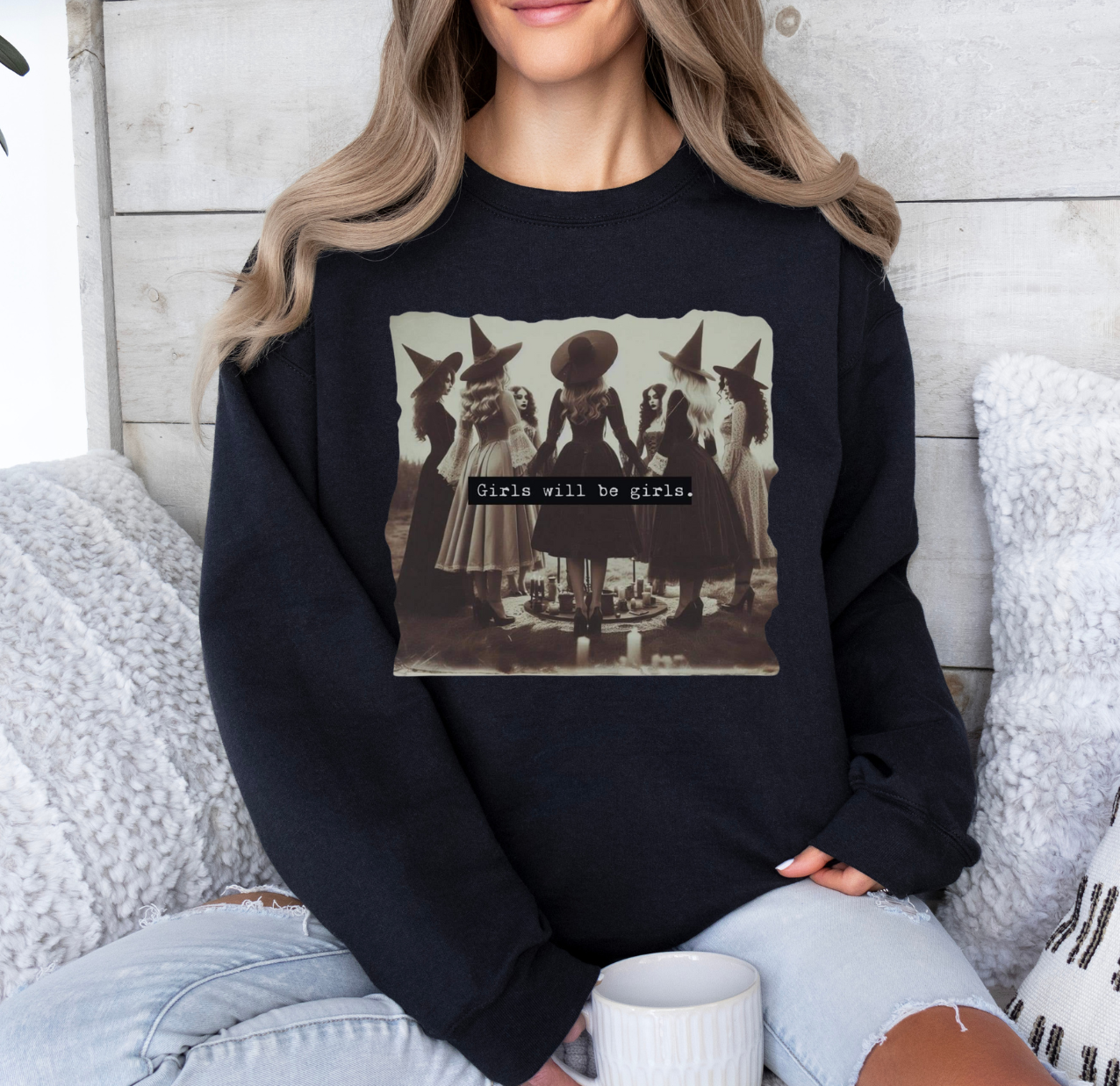 Unleash your inner witch with our 'Girls will be girls' shirt. Featuring a whimsical design of witches, this shirt is perfect for any girl who embraces her inner magic and playfully defies societal expectations. Get ready to cast a spell of style with this must-have shirt!