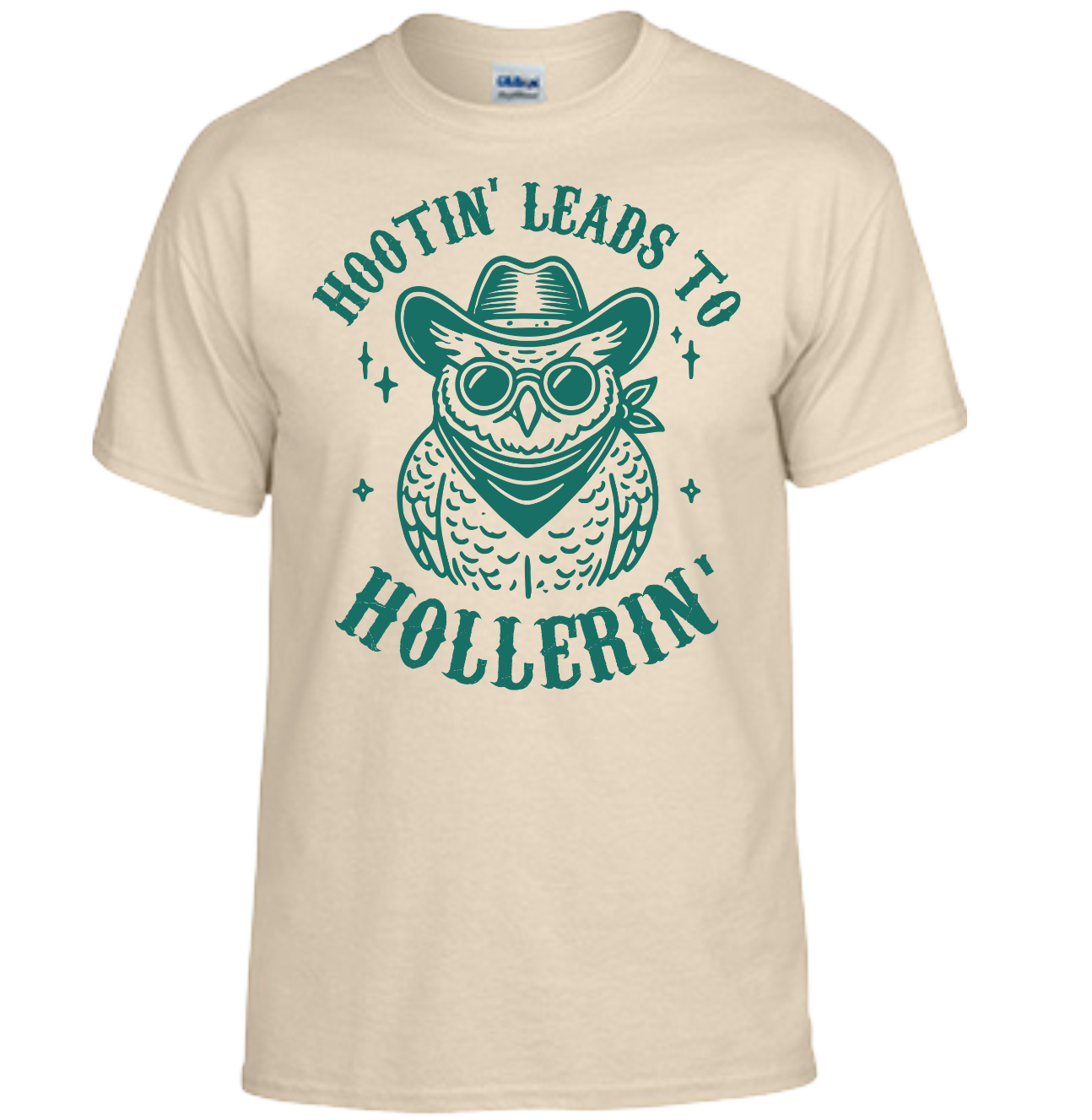 Get ready to holler with this Hootin Leads to Hollerin t-shirt featuring an adorable owl! Express your playful side with this quirky and fun shirt. Perfect for any casual occasion, this shirt is sure to bring laughs and smiles.
