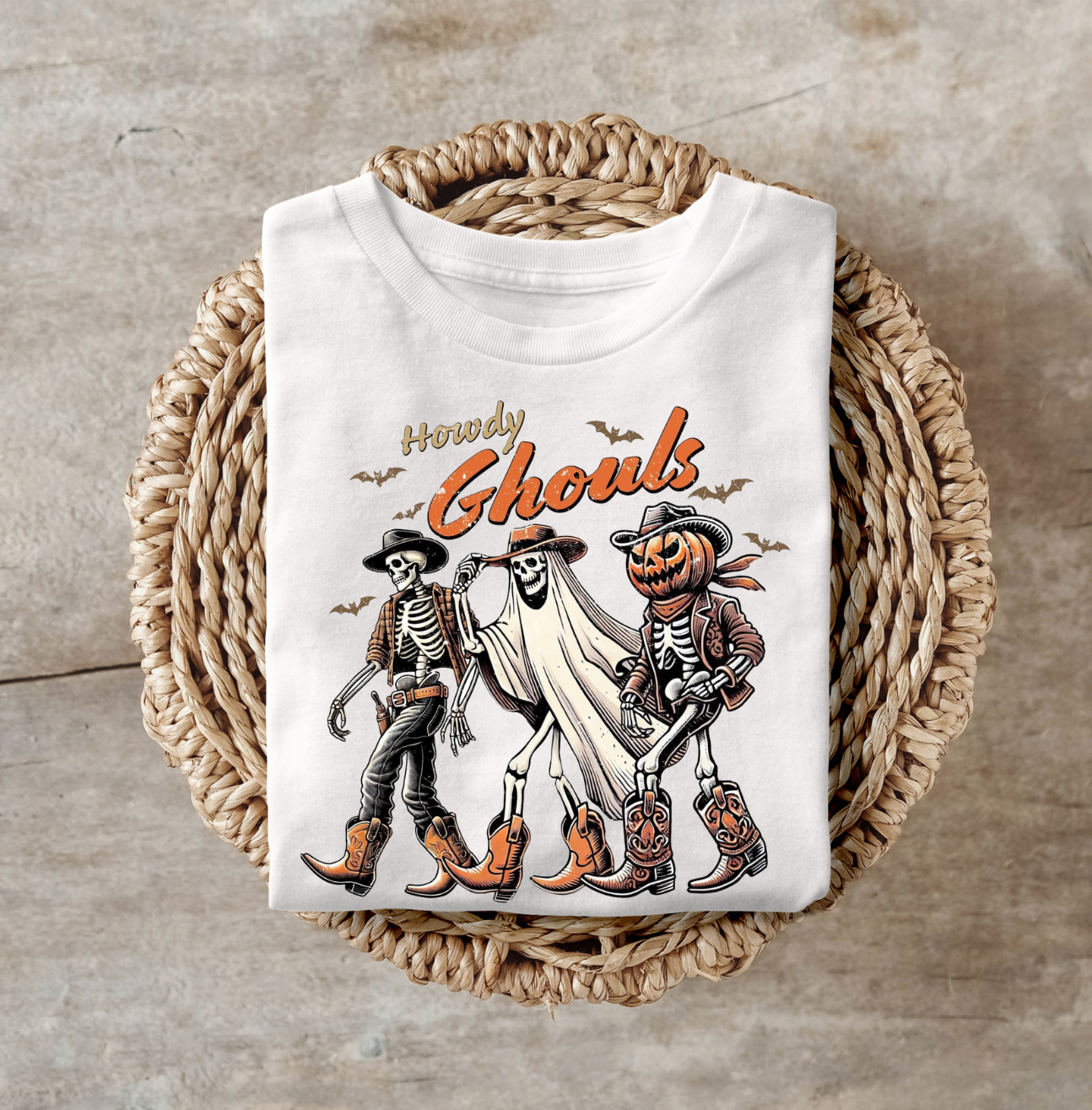 Yeehaw with the afterlife in our Howdy Ghouls t-shirt. This ghostly skeleton cowboy will have you ropin' and ridin' in no time. With stylish cowboy boots as an added bonus, you'll be the coolest ghoul in town. Get yours now!