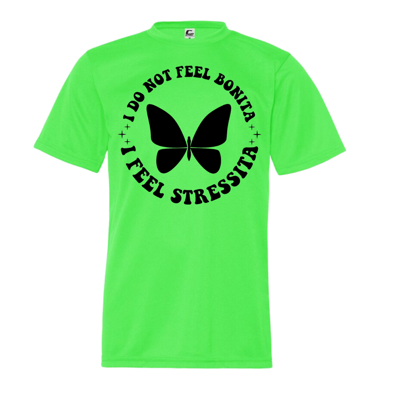 Feeling stressed? Express yourself with our "I Do Not Feel Bonita. I Feel Stressita" t-shirt. A quirky play on words and humorous design make this shirt the perfect way to add some fun to your wardrobe. Don't take yourself too seriously and let this t-shirt be your go-to for those "not-so-bonita" days.