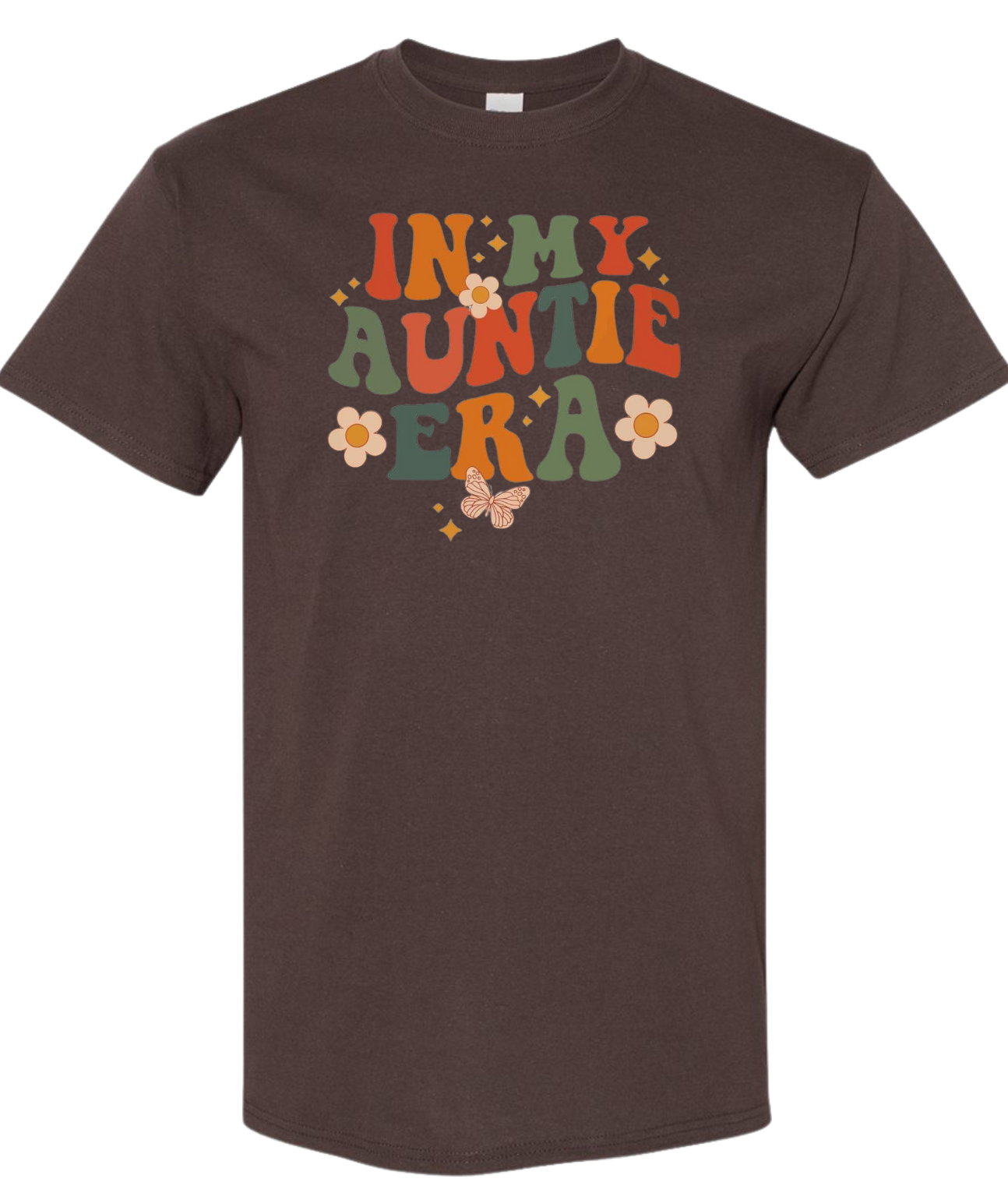 Step into a world of fun and nostalgia with our In My Auntie Era Tshirt. Perfect for anyone who loves reliving the good old days and making a statement with their fashion. Bring out your inner Auntie with this playful and quirky shirt. (Limited time only, while supplies last!)