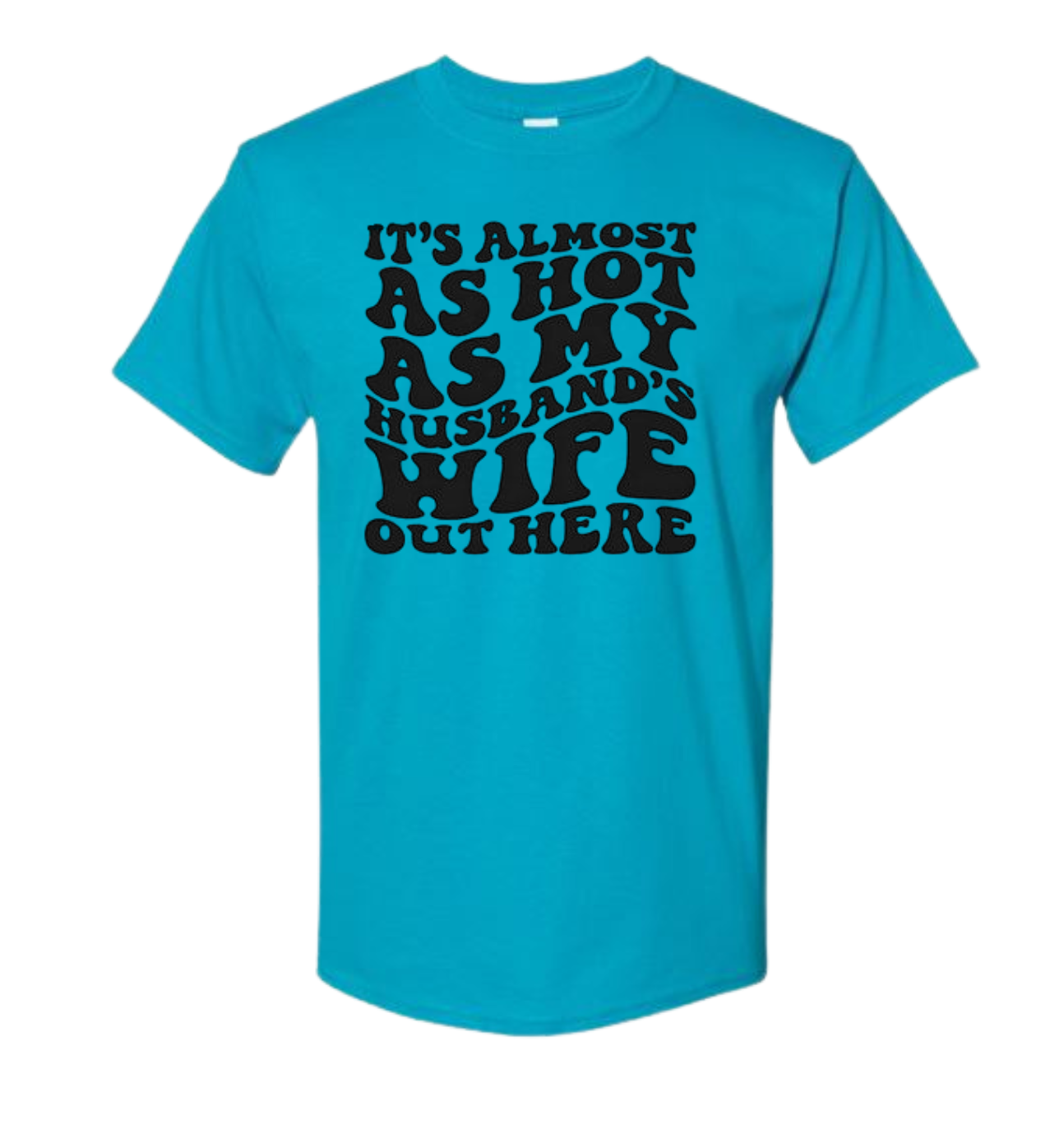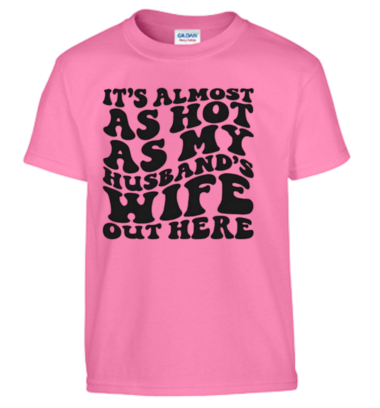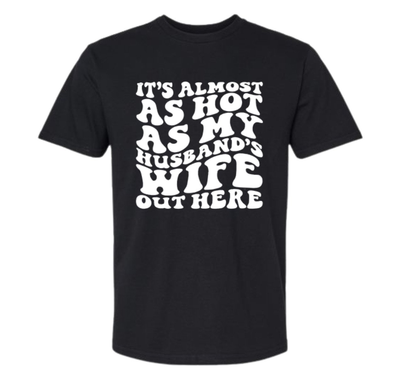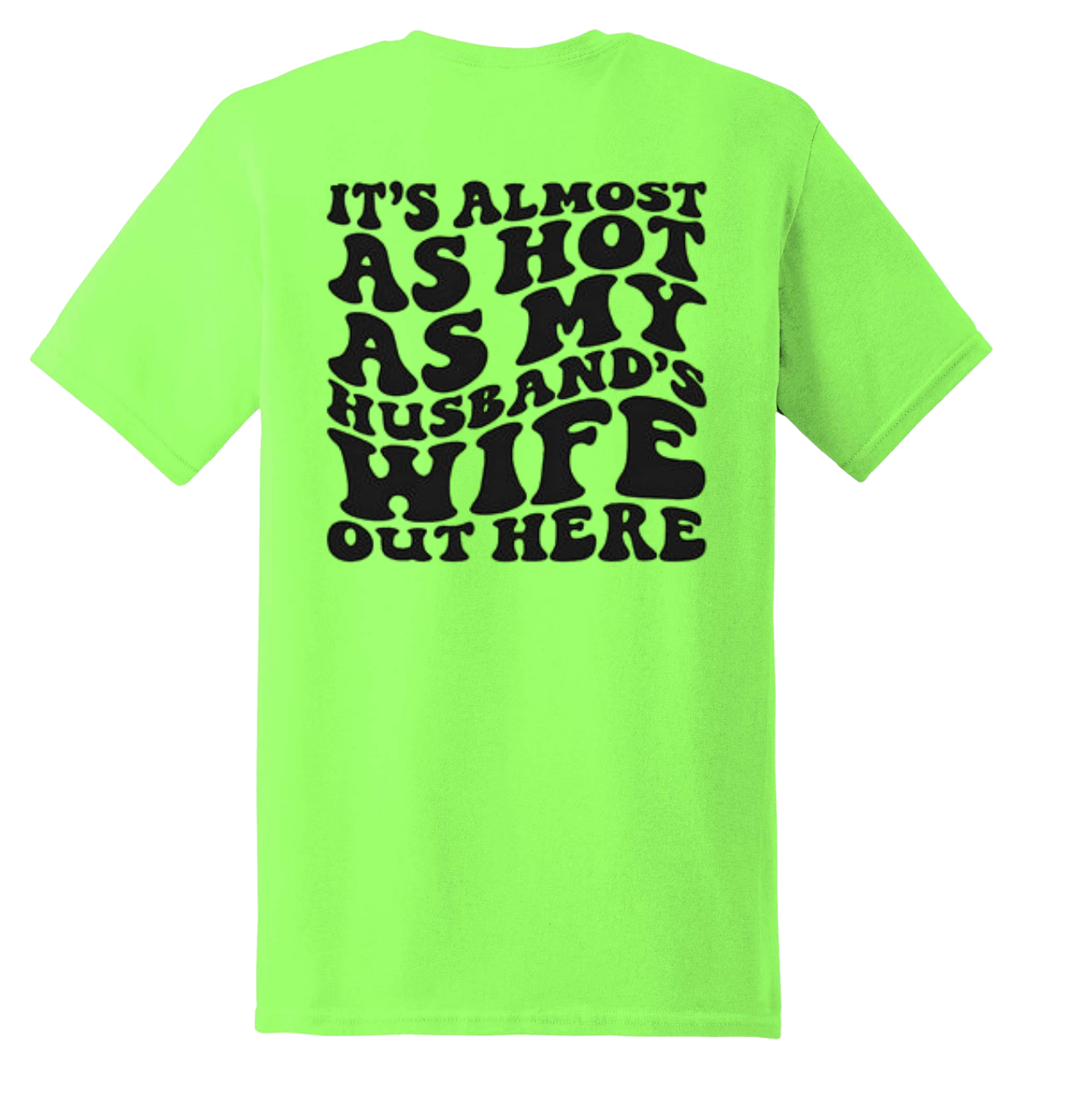 Stay cool in the heat with this quirky and playful T-shirt, aptly named "It's Almost As Hot As My Husband's Wife Out Here". Perfect for those who can take the heat and have a sense of humor. Don't sweat it, grab yours today!
