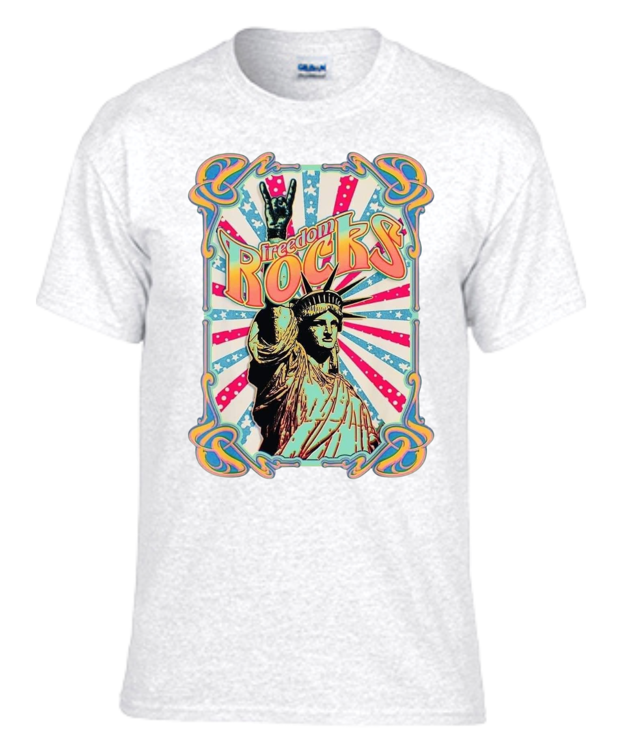 Show off your love for America with the Freedom Rocks Tshirt. Featuring a playful Statue of Liberty design, this shirt lets you proudly display your patriotic spirit. Perfect for anyone who loves word play and quirky style.