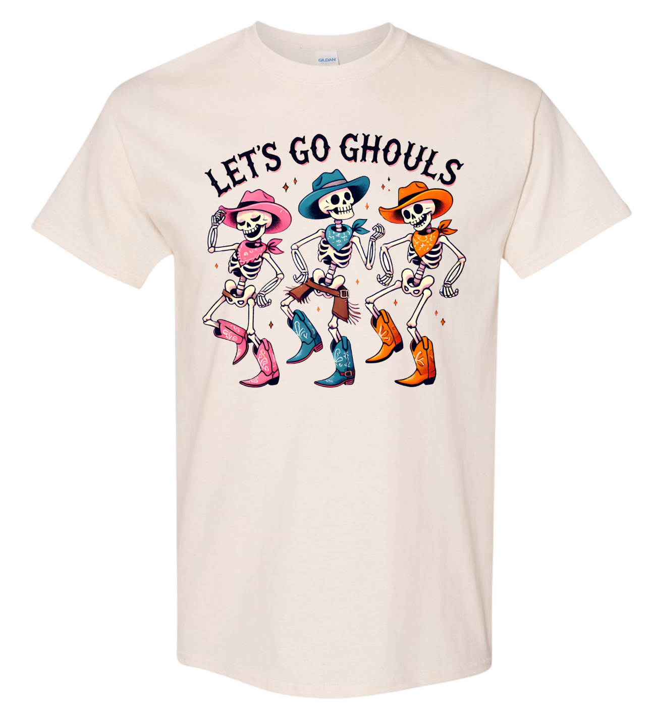 Unleash your spooky side with the Let's Go Ghouls t-shirt! Featuring playful skeletons, this shirt is sure to turn heads and bring out the laughs. Perfect for Halloween parties or everyday wear, this quirky shirt is a must-have for any ghoul enthusiast. Get yours now!