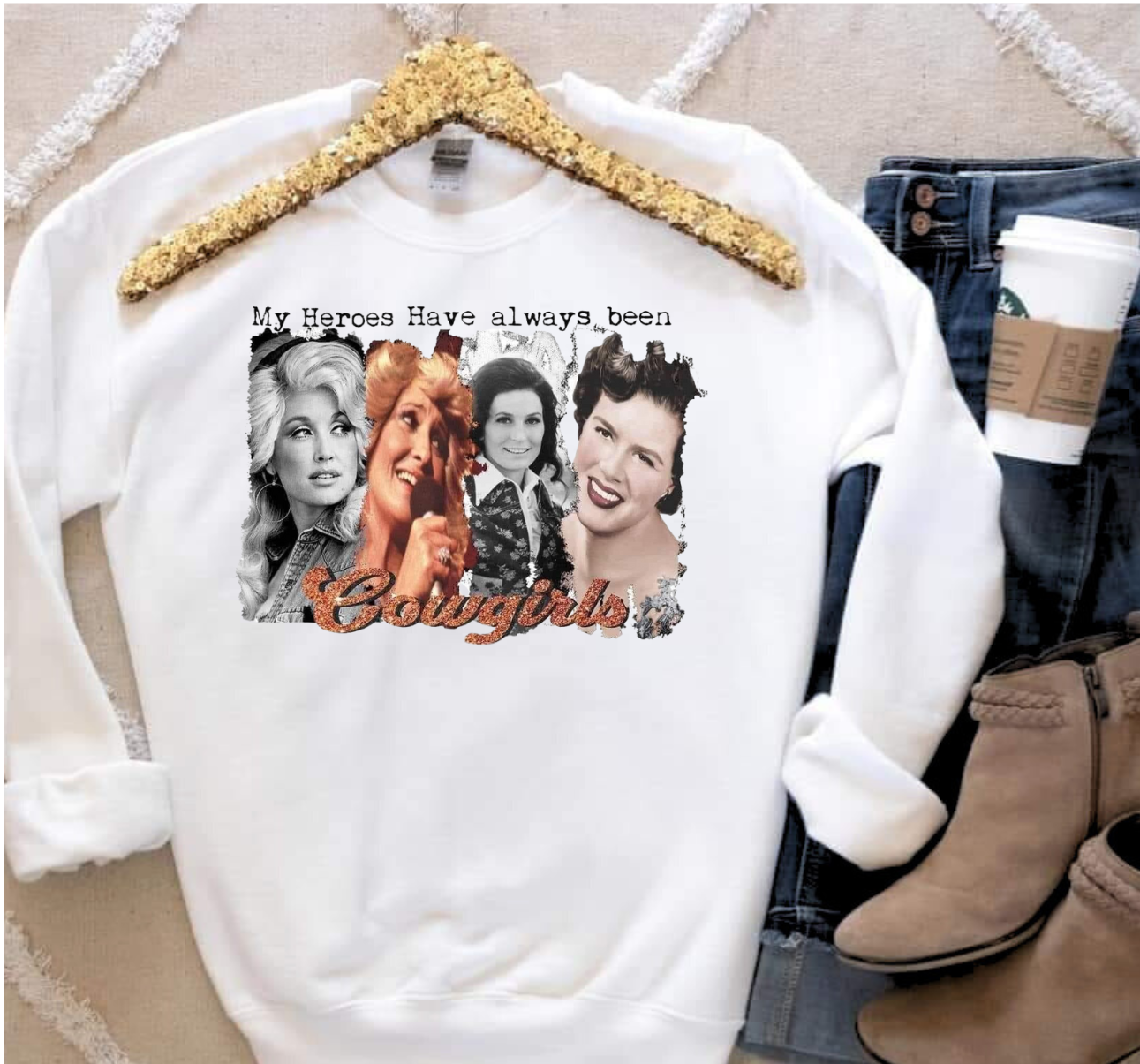 Show off your love for country music and fierce cowgirls with our My Heroes Have Always Been Cowgirls shirt, featuring Patsy Cline, Dolly Parton, and Loretta Lynn. Perfect for fans and fashionistas alike! Yeehaw!