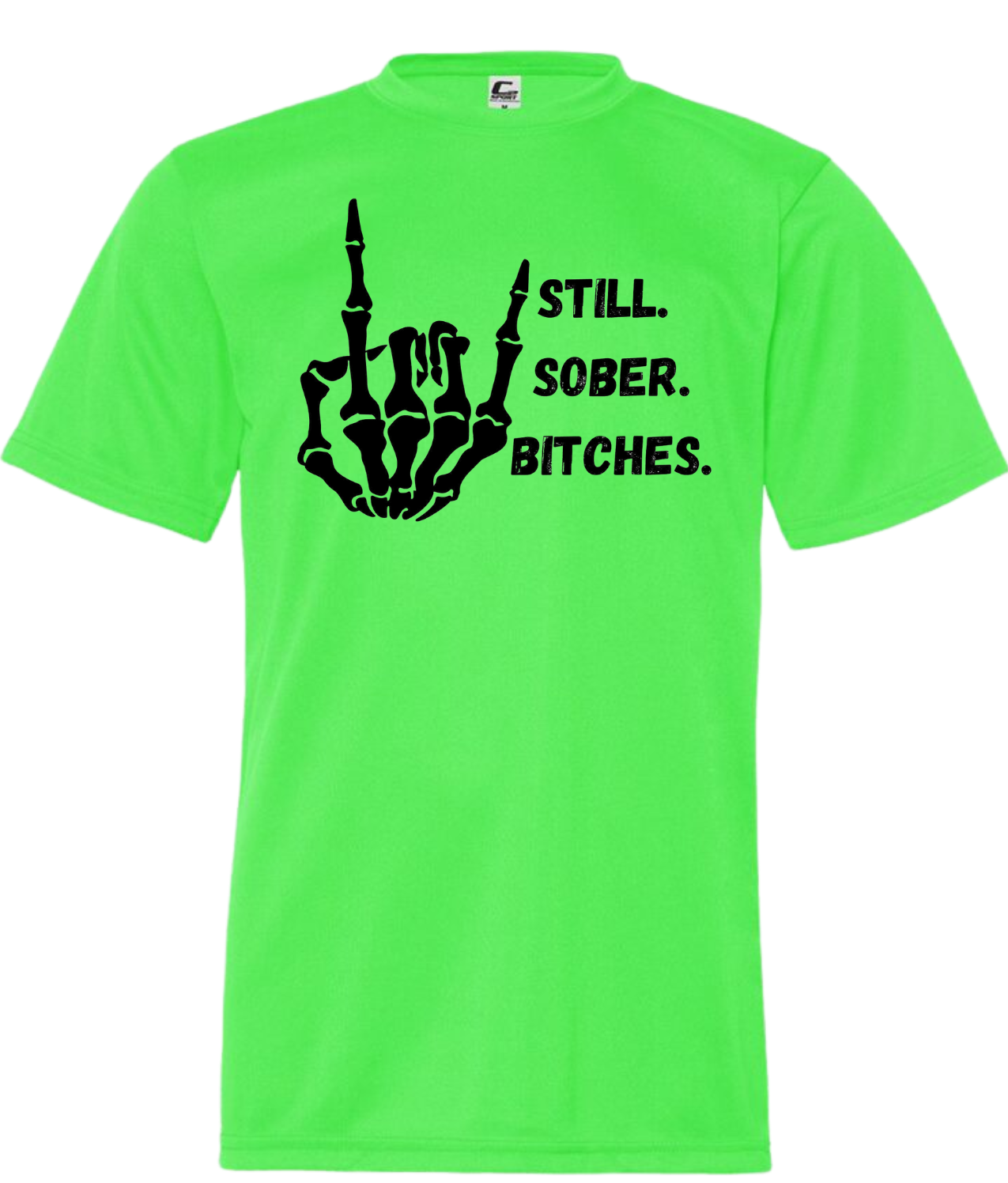 Stay sober and stylish with Still Sober Bitches Tshirt. Show off your commitment to sobriety with this quirky and playful tee. Perfect for a night out with friends or a day at the beach. Keep it fun and fashionable with Still Sober Bitches.