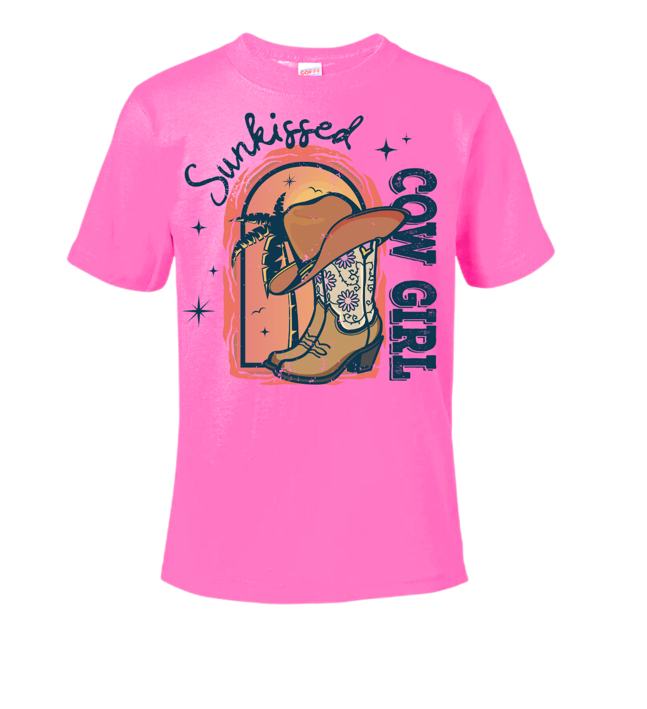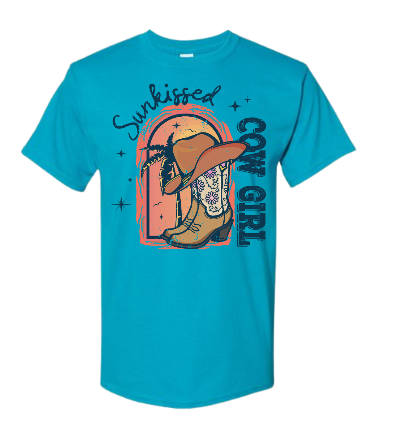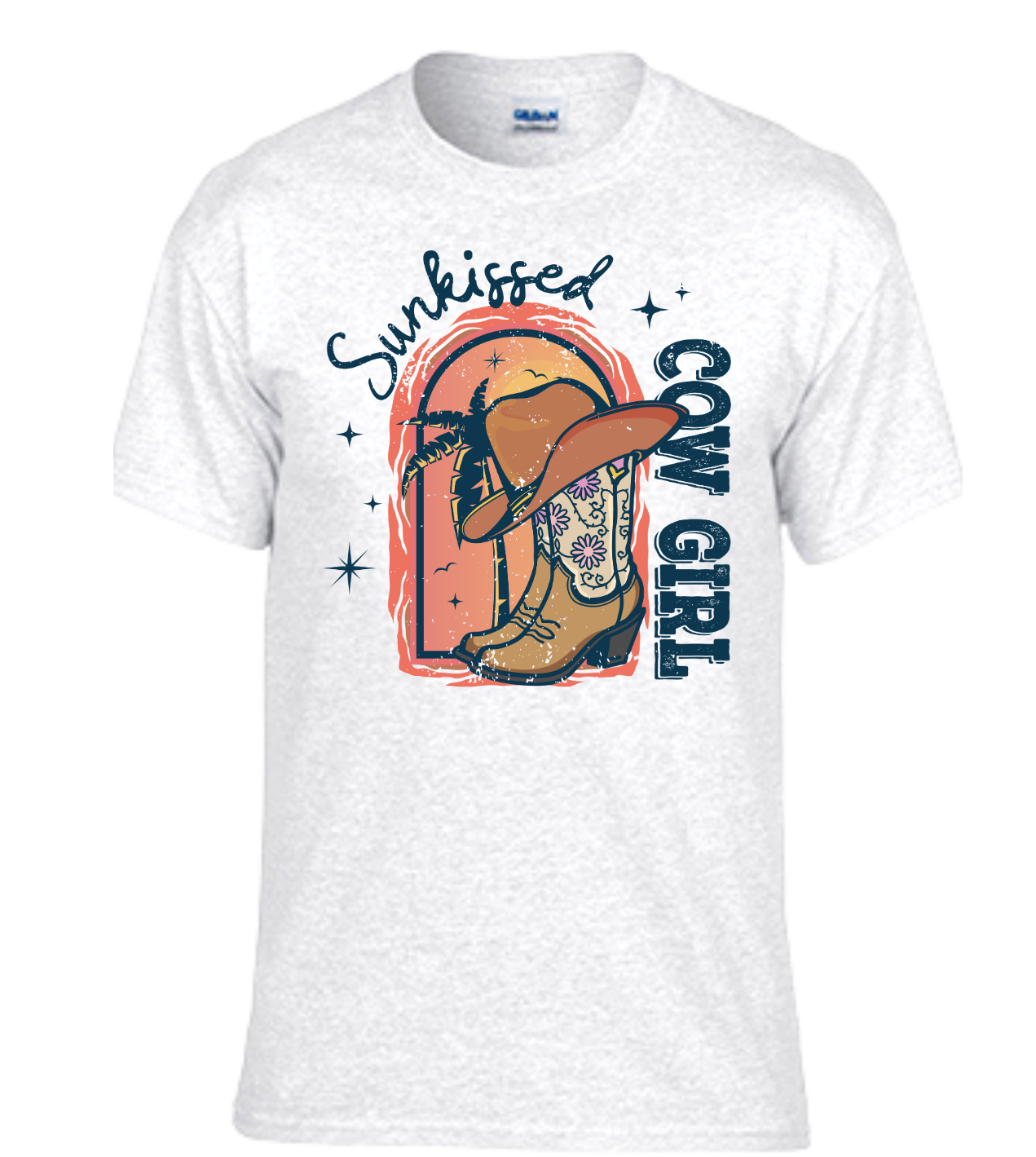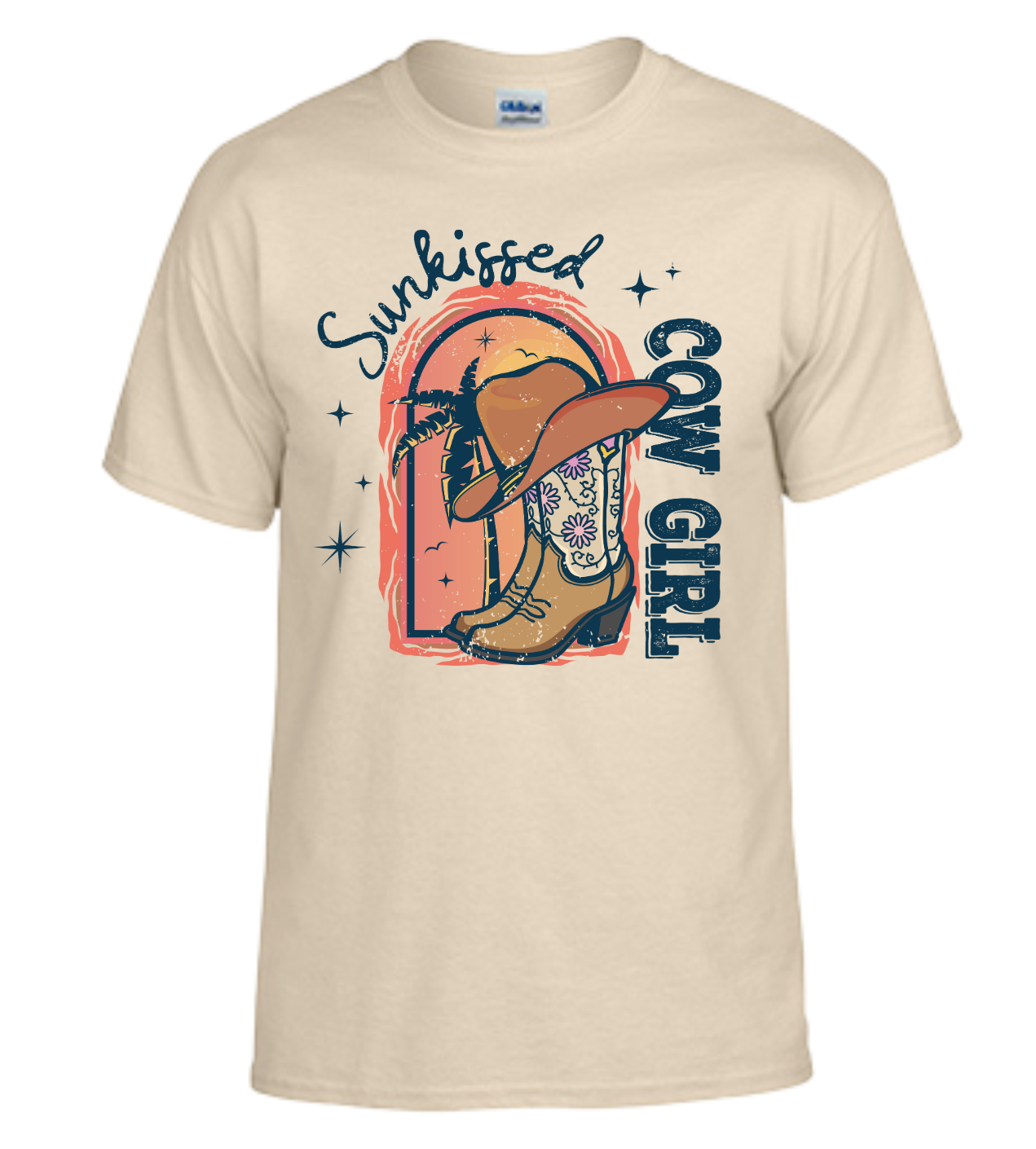 Just a cowgirl, but make it fashion with our Sunkissed Cowgirl T-shirt. This tee keeps you cool with a sun-kissed glow thanks to its soft, lightweight fabric. Perfect for any sunny adventure or rodeo, you'll be the envy of the ranch (and maybe even the runway) in this playful top. Yeehaw!