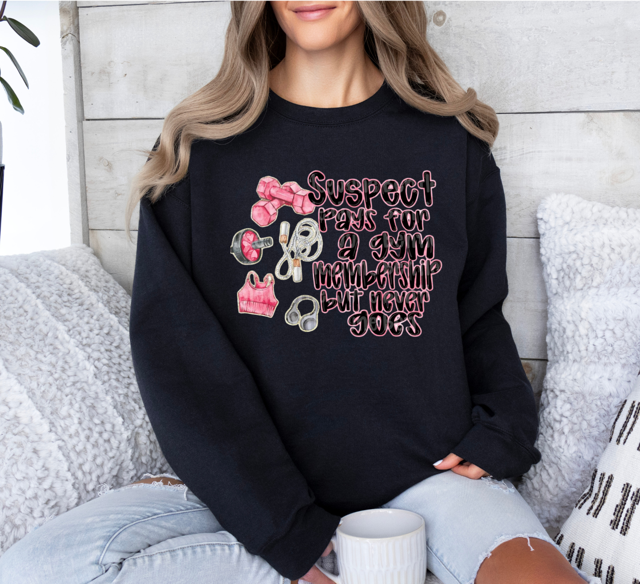 Boost your workout wardrobe with the "Suspect Pays For a Gym Membership, but Never Goes" shirt. This hilarious top offers a playful take on the classic gym membership, making it perfect for those who don't take themselves too seriously. Plus, it's a great conversation starter!