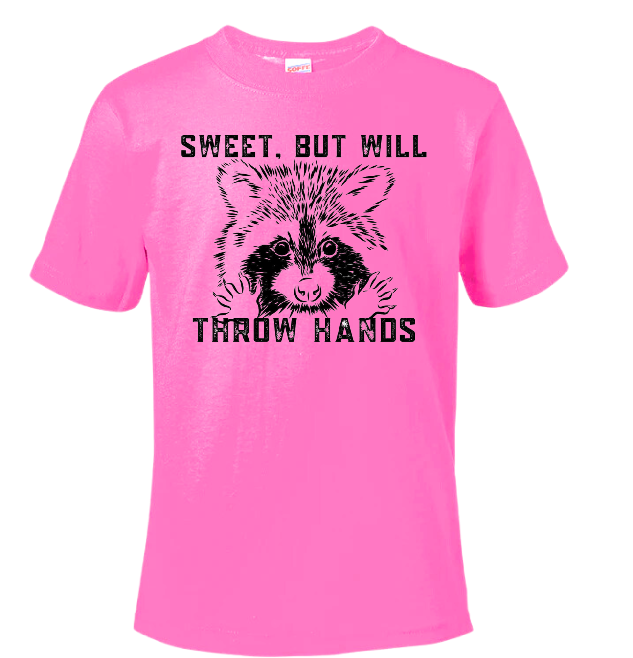 Get ready to make a statement with the Sweet But Will Throw Hands T-shirt featuring a fierce raccoon design. Perfect for those who are sweet, but won't hesitate to defend themselves. Make a quirky and playful addition to your wardrobe with this unique shirt. (Don't mess with this sweet and scrappy shirt!)