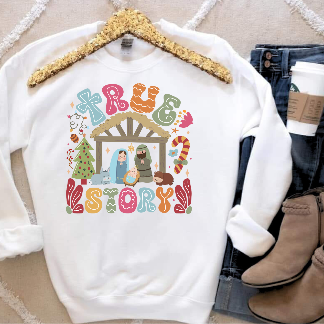 Experience the holiday season with a twist in our True Story shirt. Complete with a manger scene design, this shirt adds a playful touch to your festive wardrobe. A fun and quirky addition for those who appreciate a good true story. (Pun intended.)
