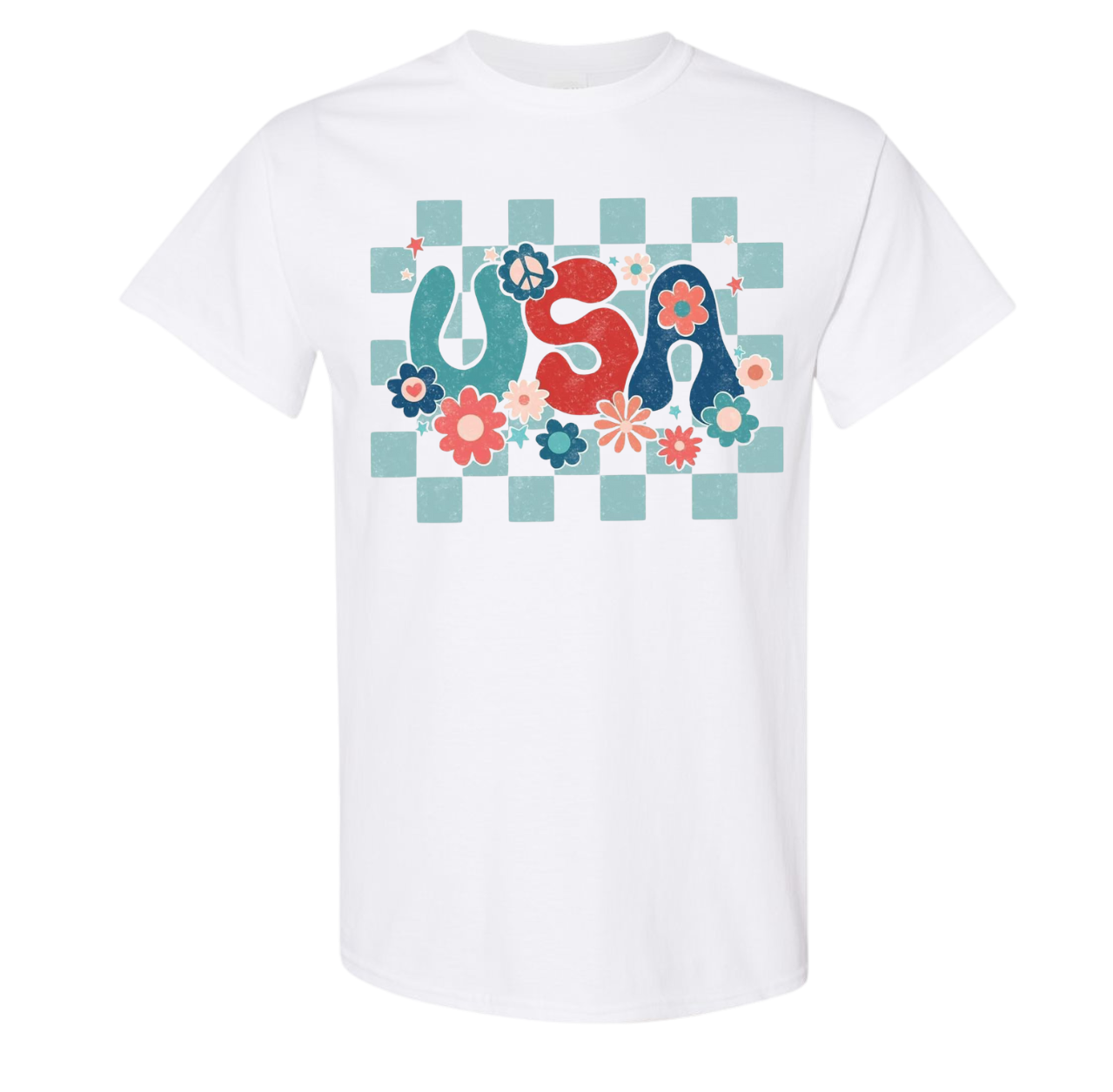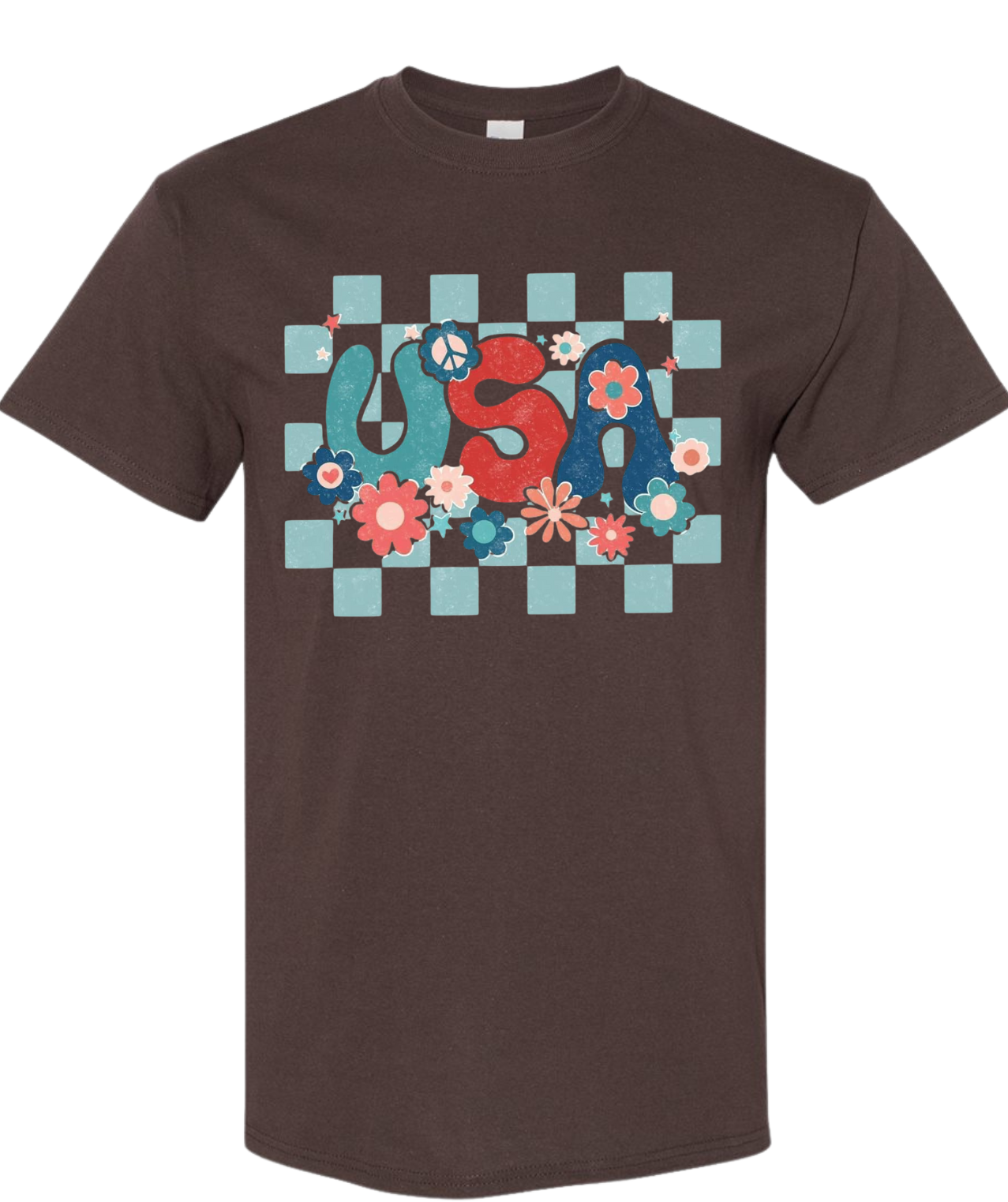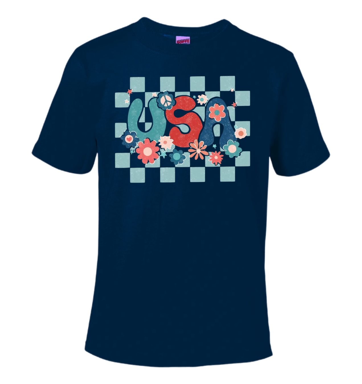 Add some retro flair to your wardrobe with this USA shirt featuring flower designs! Perfect for showcasing your love for the United States in a unique and playful way.