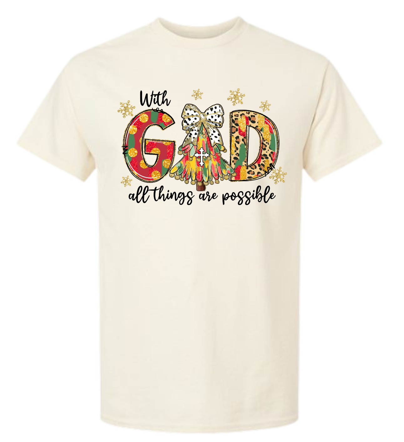 Unleash your holiday spirit with this quirky shirt featuring a Christmas Tree. With God All Things Are Possible, including looking stylish and festive (or maybe just jolly). Spread positivity and good cheer with this fun and unique tee.
